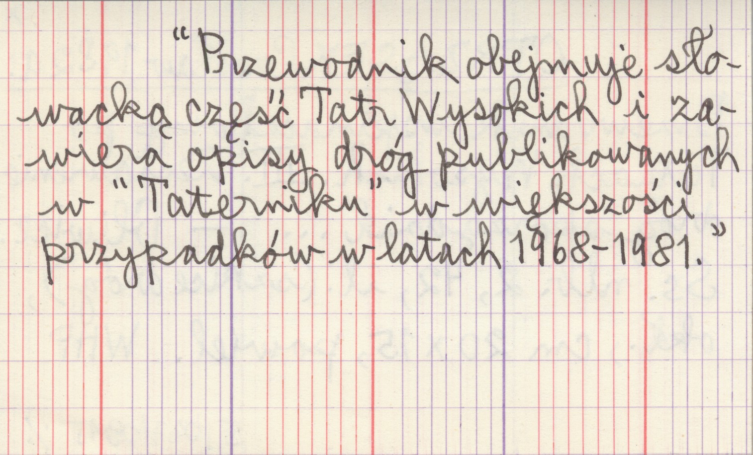 Gliwice , [2], 42 s., il., okł., 20x15 cm, powiel. Ilustracje: szkice dróg. Przewodnik obejmuje słowacką część Tatr Wysokich i zawiera opisy dróg publikowanych w "Taterniku" w większości przypadków w latach 1968-1981.