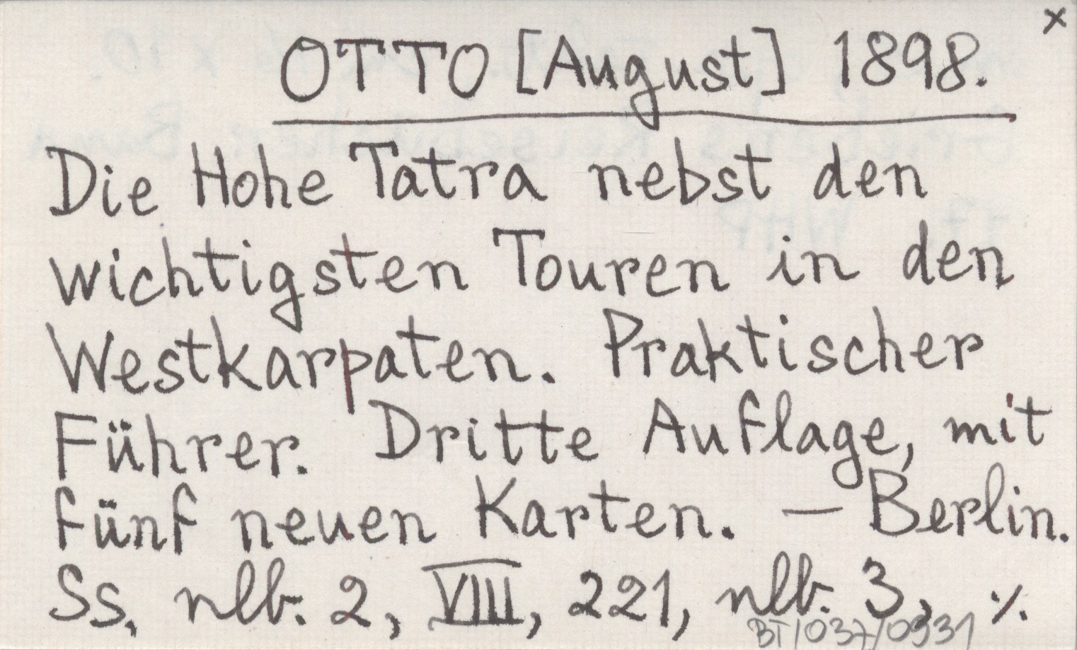OTTO [August] 1898 Die Hohe Tatra nebst den wichtigsten Touren in den Westkarpaten. Praktischer Führer. Dritte Auflage, mit fünf neuen Karten.