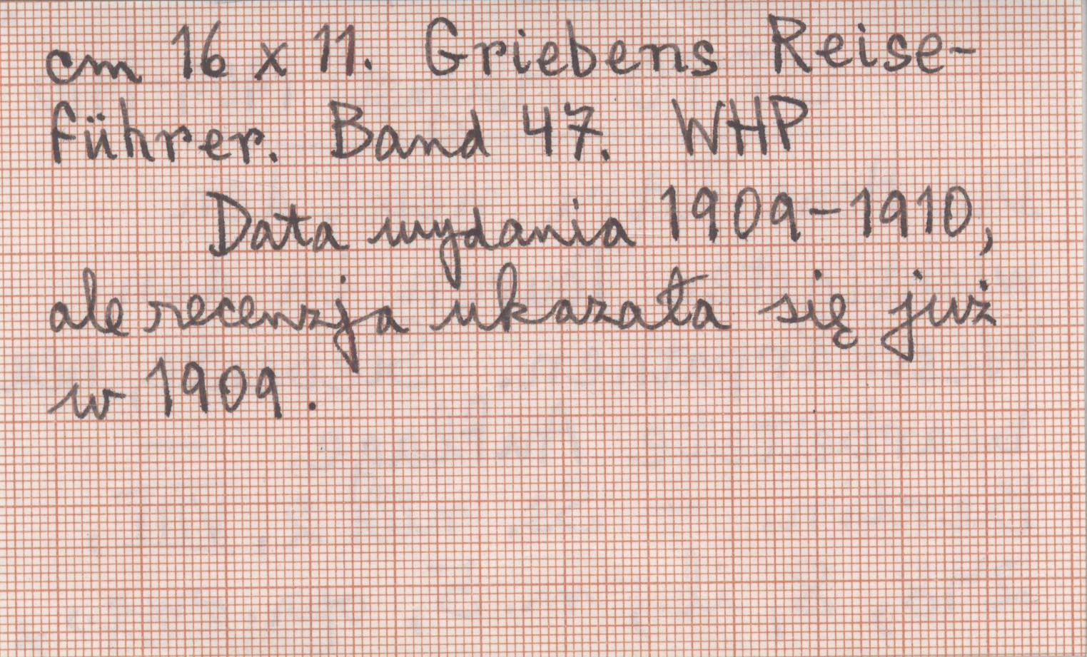 WYD: 7 Berlin (Griebens Reiseführer. ; 47) , [2], VIII, 248, 8 s., il., 5 m., opr. oryg., 16x11 cm. Data wydania 1909-1910, ale recenzja ukazała się już w 1909. REC: Kordys Roman, Taternik (lwów) 3 (1909), nr 3: 67-68.