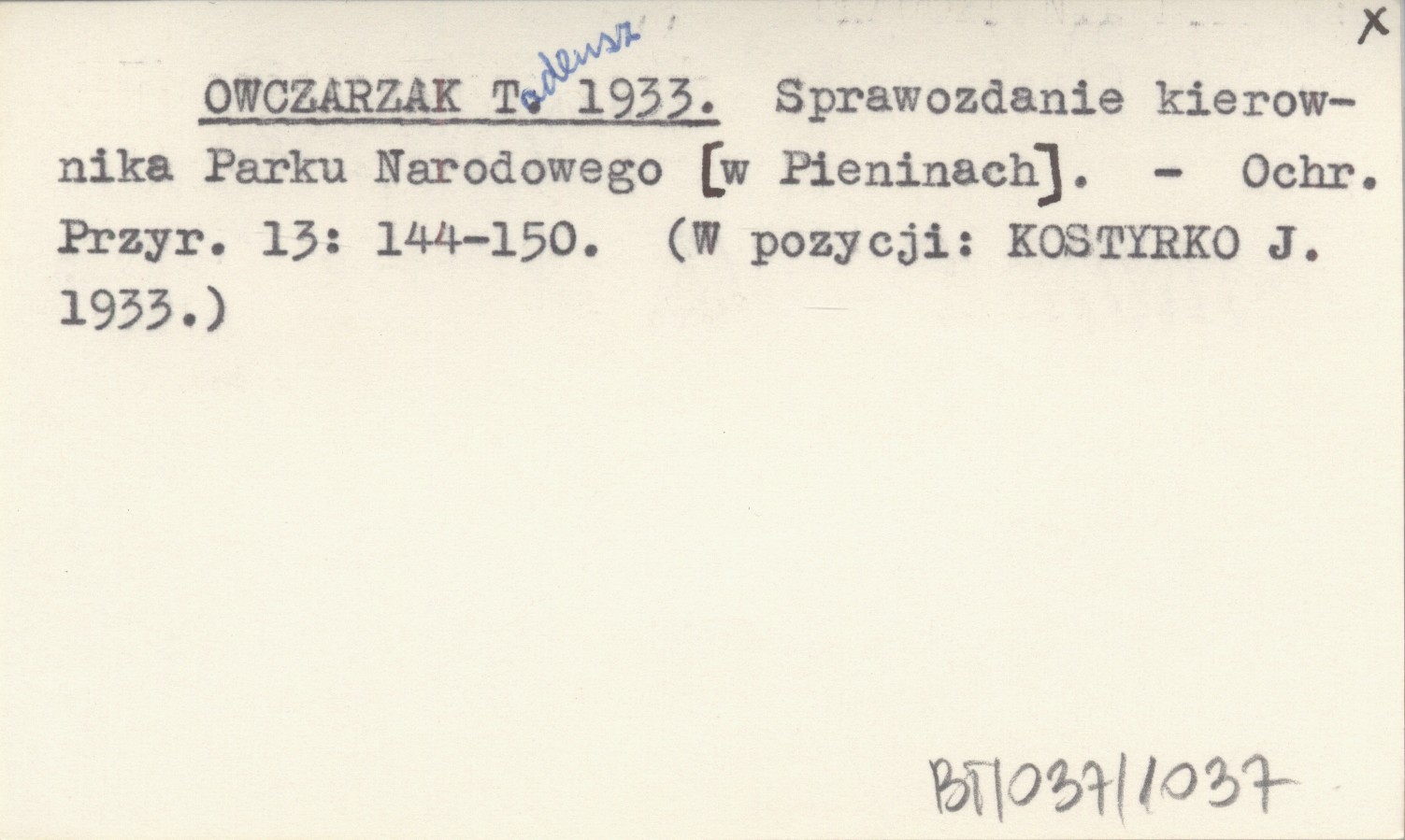 OWCZARZAK Tadeusz 1933 Sprawozdanie kierownika Parku Narodowego [w Pieninach].