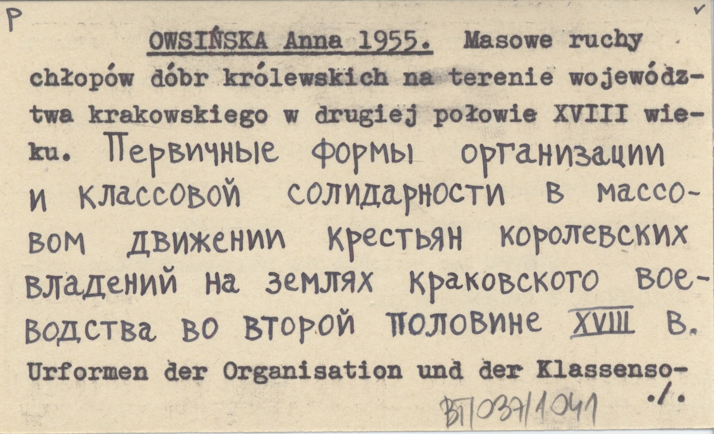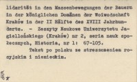 OWSIŃSKA Anna 1955 Masowe ruchy chłopów dóbr królewskich na terenie województwa krakowskiego w drugiej połowie XVIII wieku. Pervichnyye formy organizatsii i klassovoy solidarnosti v massovom dvizhenii krest'yan korolevskikh viadeniy na zemlyakh krakovskoto voyevodstva vo vtoroy polovine XVIII w. Urformen der Organisation und der Klassensolidarität in den Massenbewegungen der Bauern in der königlichen Domänen der Woiwodschft Kraków in der II Hälfte des XVIII Jahrhunderts.