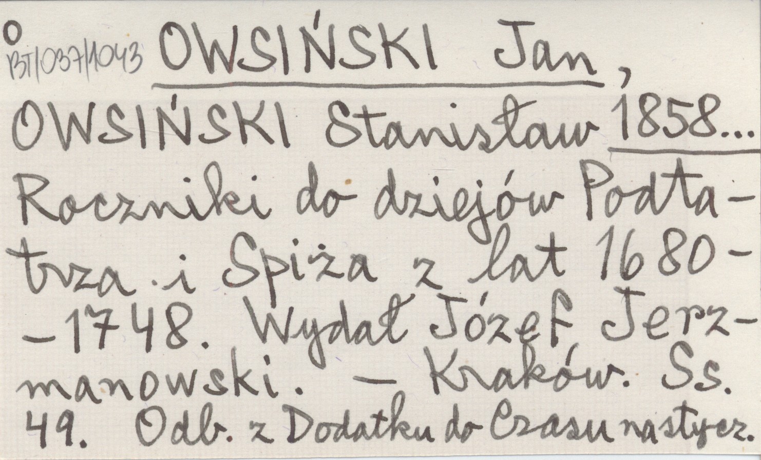 OWSIŃSKI Jan OWSIŃSKI, Stanisław. ; 1858... Roczniki do dziejów Podtatrza i Spiża z lat 1680-1748.