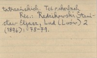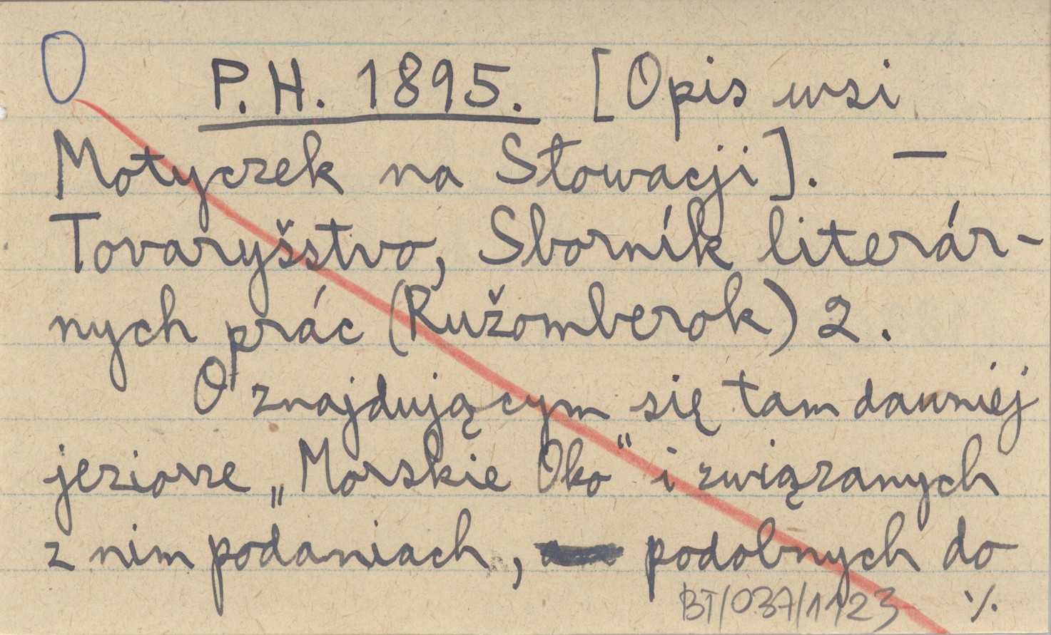 Tovaryšstvo, Sborník literárnych prác (Ružomberok) , 2. O znajdującym się tam dawniej jeziorze "Morskie Oko" i związanych z nim podaniach, podobnych do tatrzańskich. Też o skarbach. REC: Radzikowski Stanisław Eljasz, Lud (Lwów) 2 (1896): 78-79.