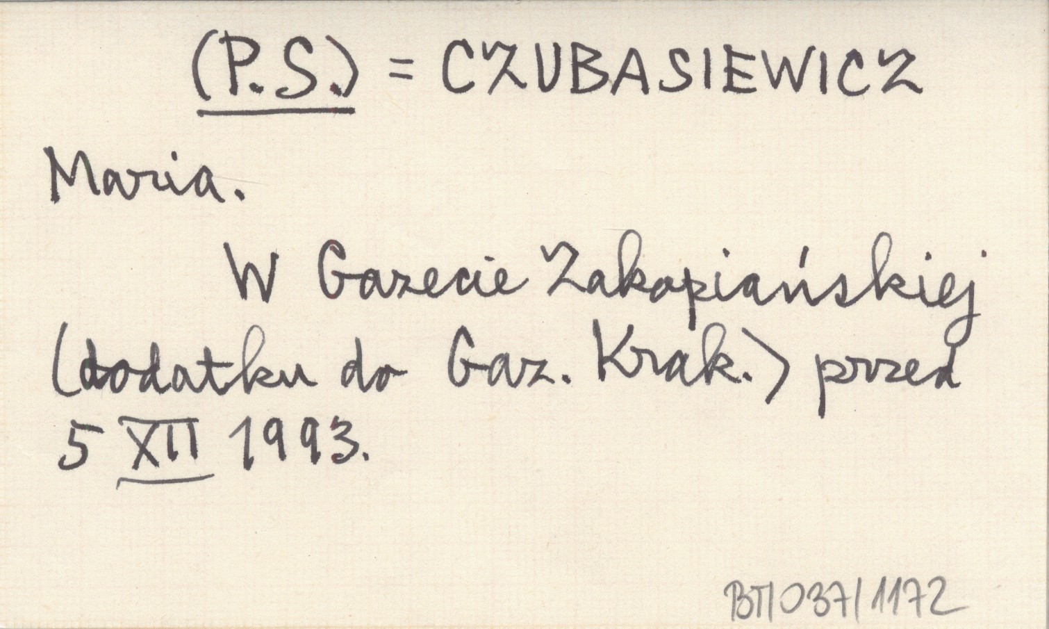 (P.S.) CZUBASIEWICZ Maria W Gazecie Zakopiańskiej (dodatku do Gazety Krakowskiej) przez 5 XII 1993.