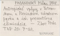 PACANOVSKÝ Milan 1978... Antropické vplyvy v Tatranskom a Pieninskom národnom parku a ich preventívna eliminácia.