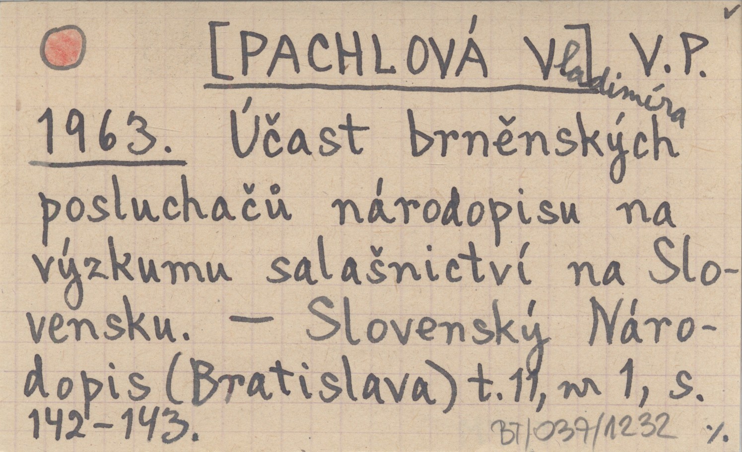 V. P. [PACHLOVÁ Vladimíra] 1963 Účast brněnských posluchačů národopisu na výzkumu salaąnictví na Slovensku.
