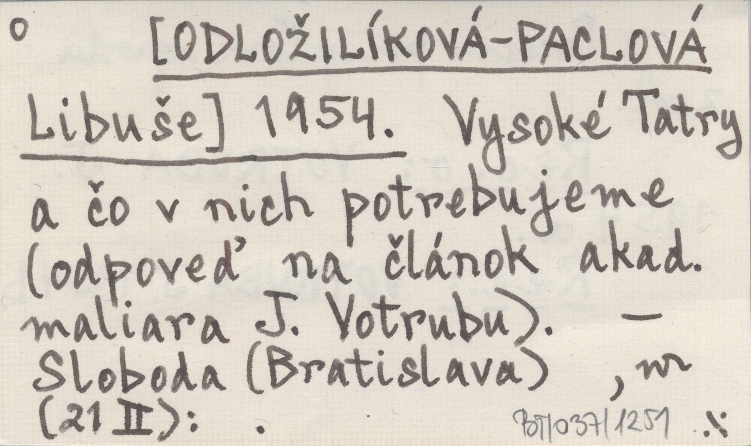 [ODLOŽILÍKOVÁ-PACLOVÁ Libuše] 1954 Vysoké Tatry a čo v nich potrebujeme (odpoveď na článok akad. maliara J. Votrubu).