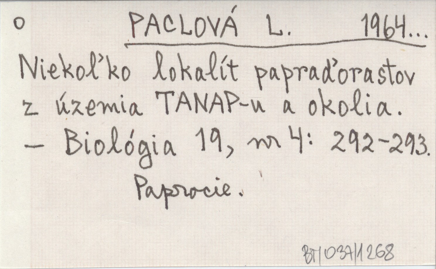 PACLOVÁ L. 1964... Niekoľko lokalít papraďorastov z územia TANAP-u a okolia.