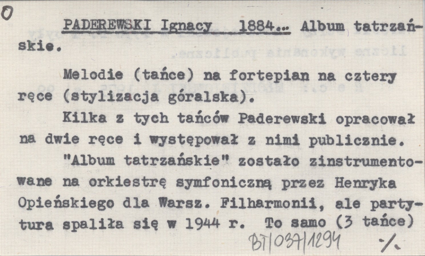 , Melodie (tańce) na fortepian na cztery ręce (stylizacja góralska). Kilka z tych tańców Paderewski opracował na dwie ręce i występował z nimi publicznie. "Album tatrzańskie" zostało zinstrumentowane na orkiestrę symfoniczną przez Henryka Opieńskiego dla Warszawskiej Filharmonii, ale partytura spaliła się w 1944 r. To samo (3 tańce) zrobił Jerzy Młodziejowski w 1956 r. i były liczne wykonania publiczne. REC: SZURMIAK-BOGUCKA A. 1961 (s. 280). MŁODZIEJOWSKI J. 1975: 99.