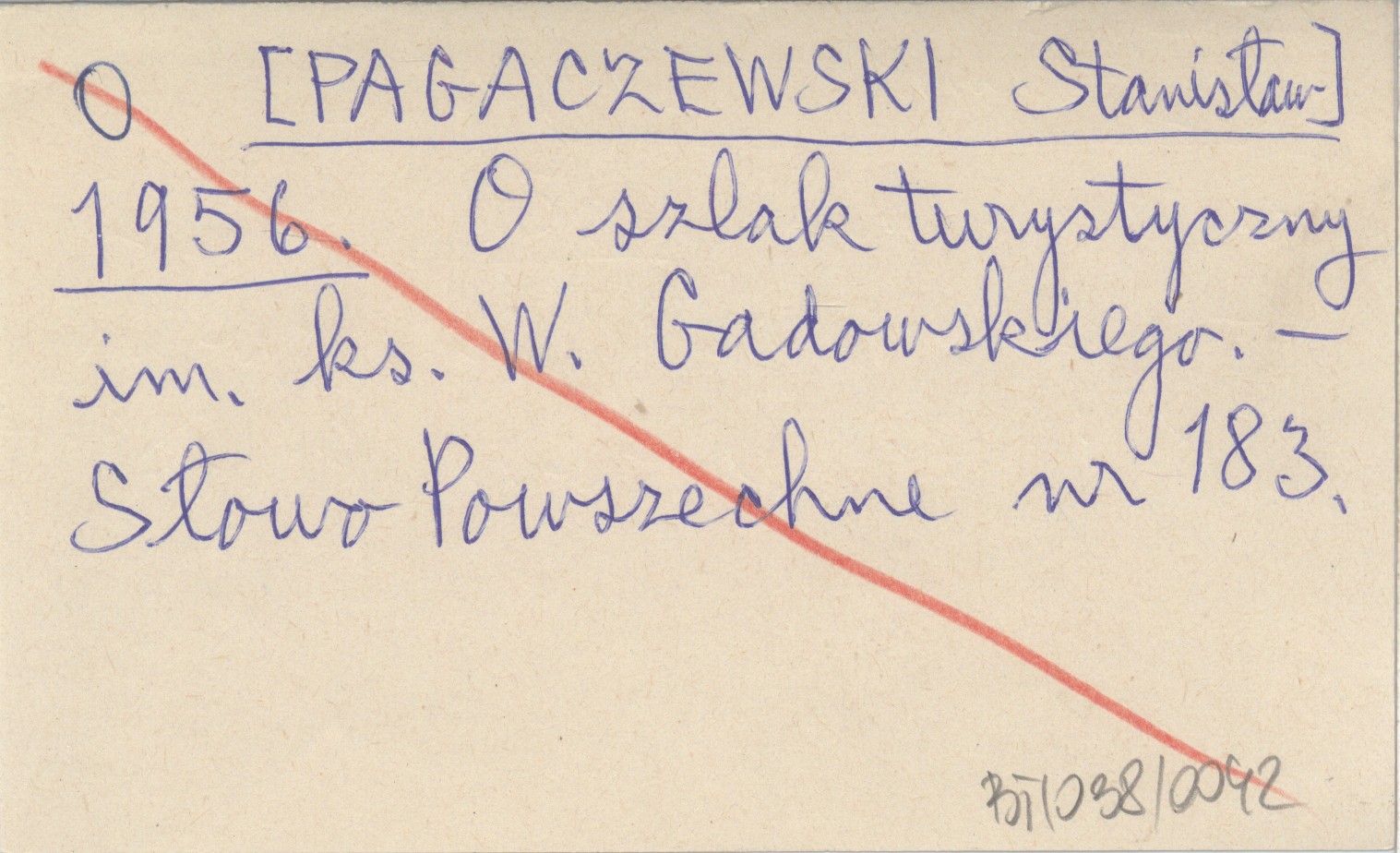 [PAGACZEWSKI Stanisław] 1956 O szlak turystyczny im. ks. W. Gadowskiego.