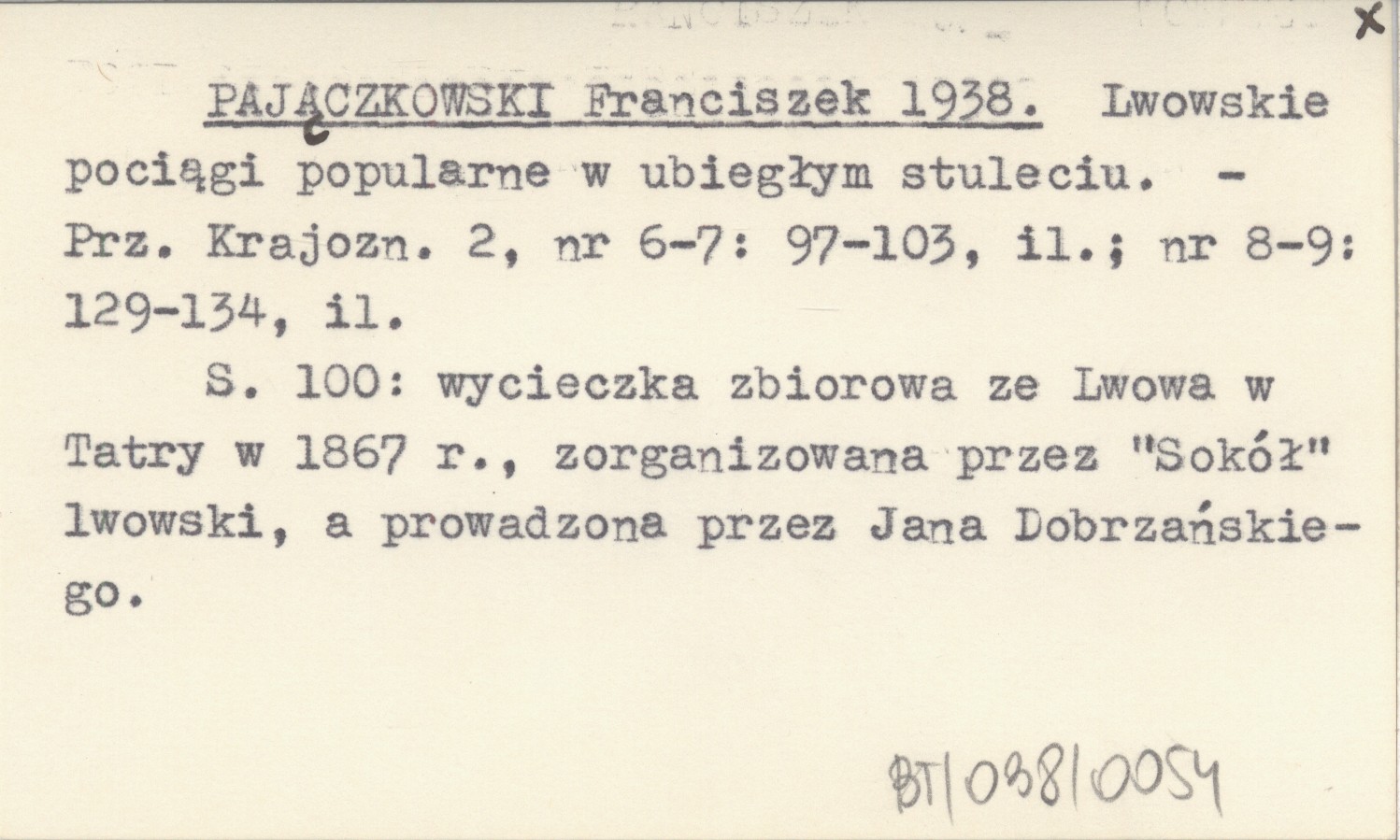 Przegląd Krajoznawczy, 2, nr 6-7: 97-103, il. ; nr 8-9: 129-134, il. S. 100: wycieczka zbiorowa ze Lwowa w Tatry w 1867 r., zorganizowana przez "Sokół" lwowski, a prowadzona przez Jana Dobrzańskiego.