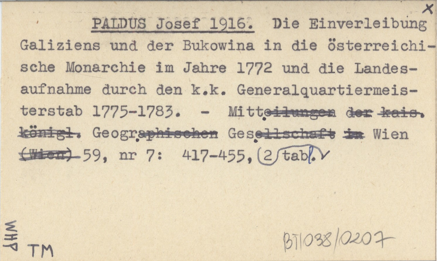 PALDUS Josef 1916 Die Einverleibung Galiziens und der Bukowina in die österreichische Monarchie im Jahre 1772 und die Landesaufnahme durch den k.k. Generalquartiermeisterstab 1775-1783.