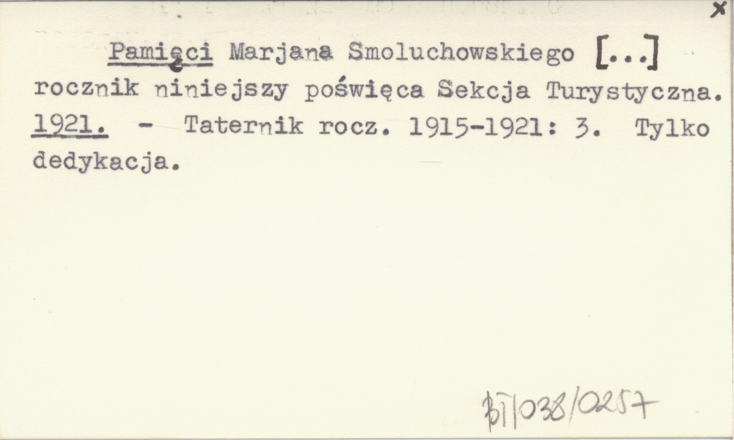 Pamięci Marjana Smoluchowskiego [...] rocznik niniejszy poświęca Sekcja Turystyczna. 1921
