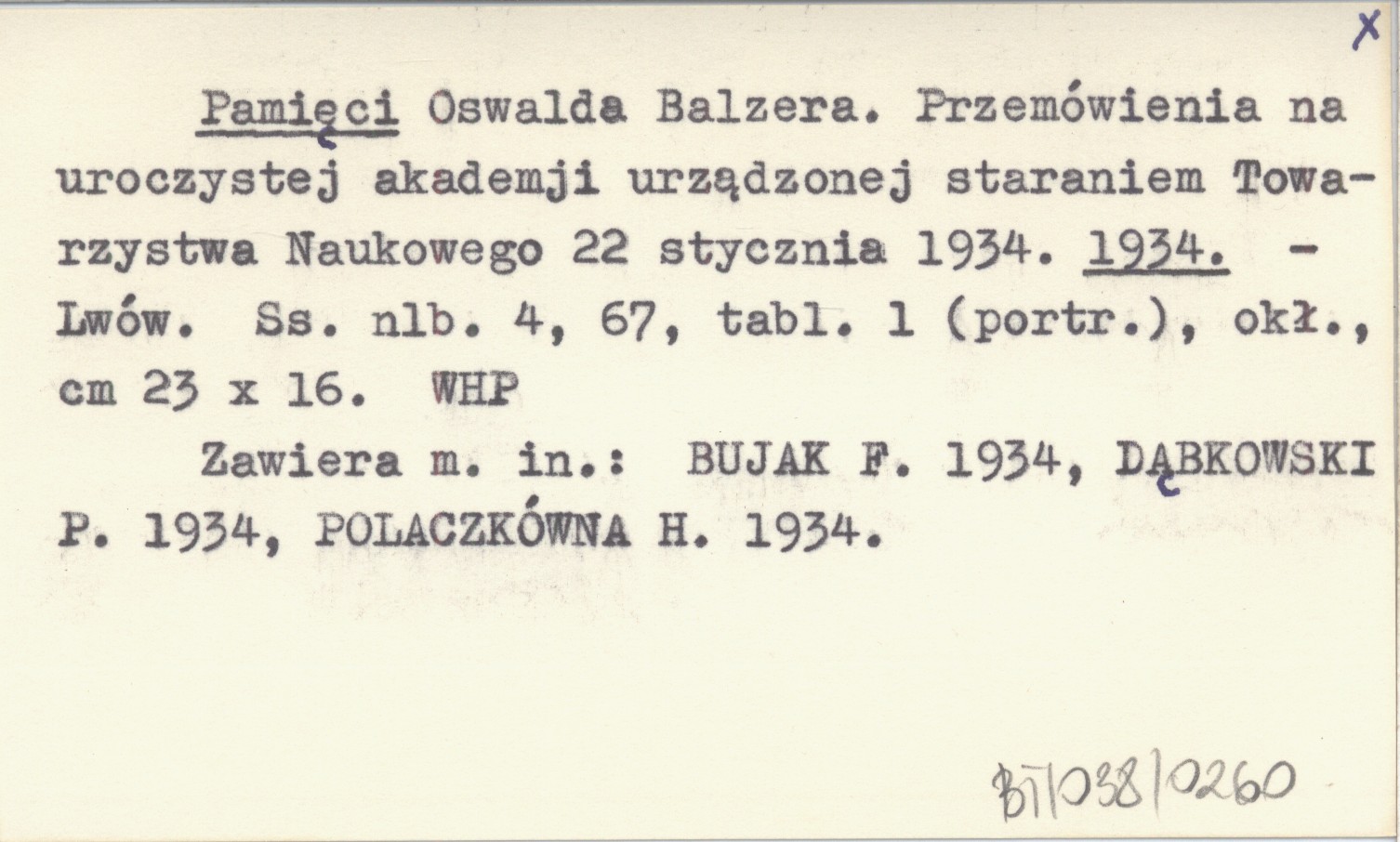 Pamięci Oswalda Balzera. Przemówienia na uroczystej akademji urządzonej staraniem Towarzystwa Naukowego 22 stycznia 1934. 1934