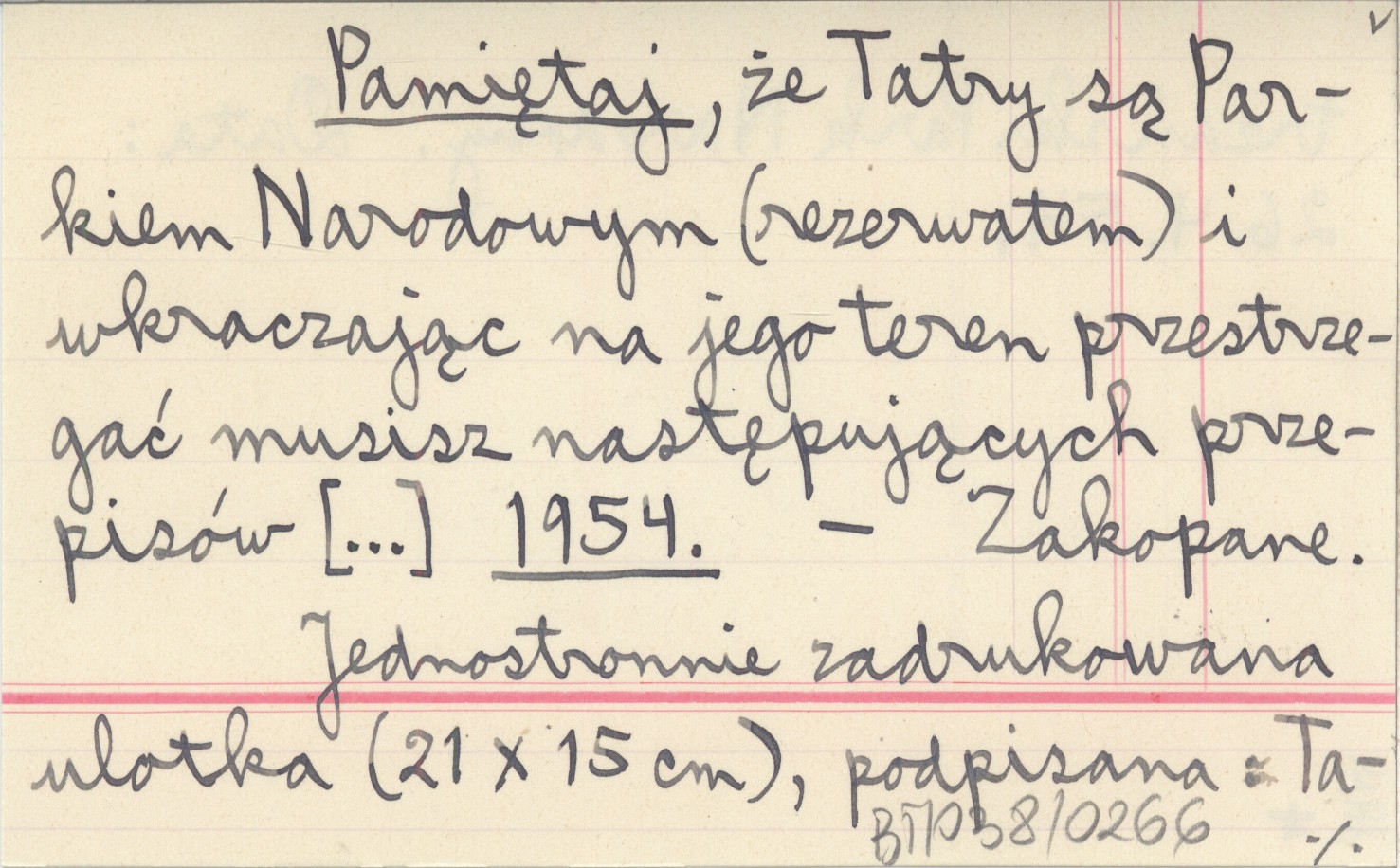 Pamiętaj, że Tatry są Parkiem Narodowym (rezerwatem) i wkraczając na jego teren przestrzegać musisz następujących przepisów [...]. 1954
