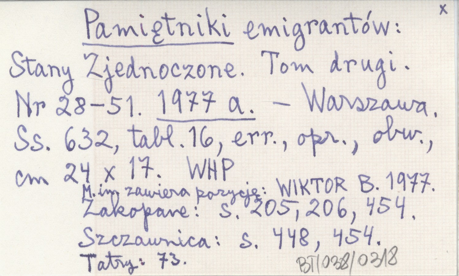 Warszawa , 632 s., 16 k. tabl., err., opr., obw., 24x17 cm. Zakopane: s. 205, 206, 454. Szczawnica: s. 448, 454. Tatry: 73. M.in. zawiera pozycję: WIKTOR B. 1977