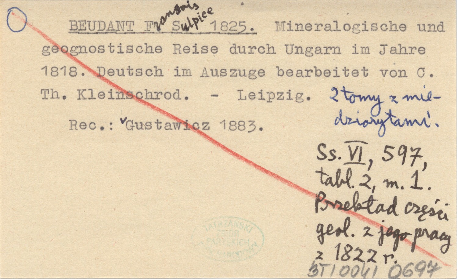 Leipzig , T. 1-2. ; VI, 597 s., 2 k. tabl., 1 mapa. Przekład części geol. z jego pracy z 1822 r. ; 2 tomy z miedziorytami. REC: GUSTAWICZ 1883.