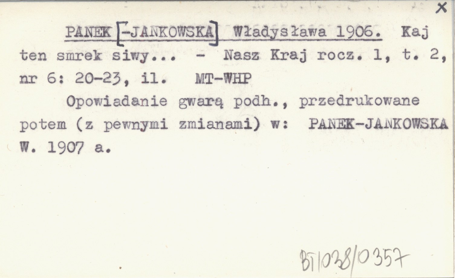 Nasz Kraj, R. 1, t. 2, nr 6: 20-23, il. Opowiadanie gwarą podh., przedrukowane potem (z pewnymi zmianami) w: PANEK-JANKOWSKA W. 1907 a