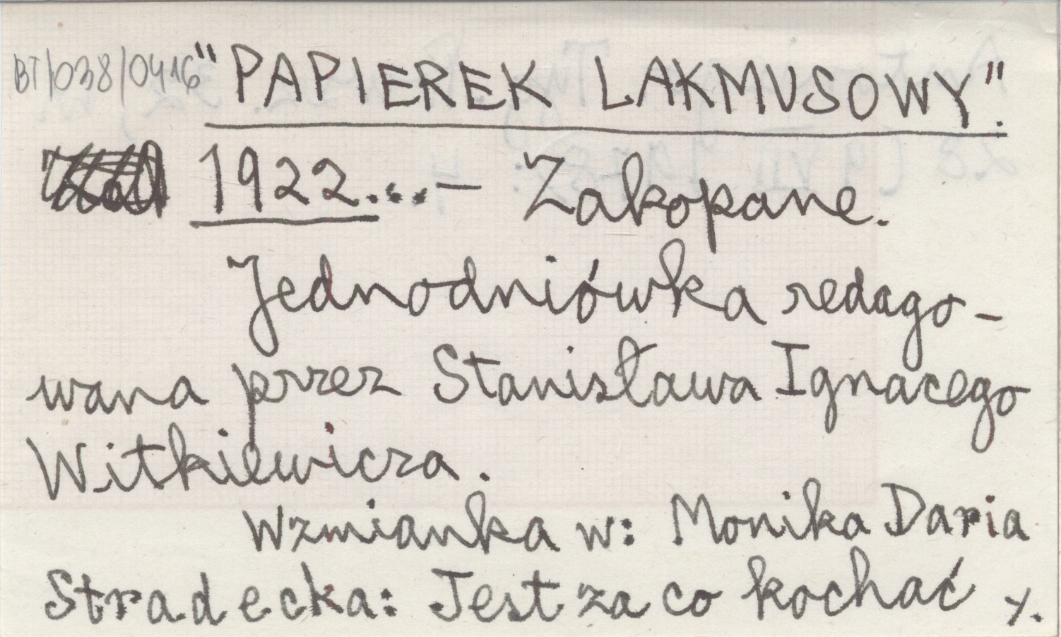 Papierek Lakmusowy Zakopane Jednodniówka redagowana przez Stanisława Ignacego Witkiewicza. Wzmianka w: Monika Daria Stradecka: Jest za co kochać Antoniego. Tyg. Powsz. 32, nr 28 (9 VII 1978): 4.