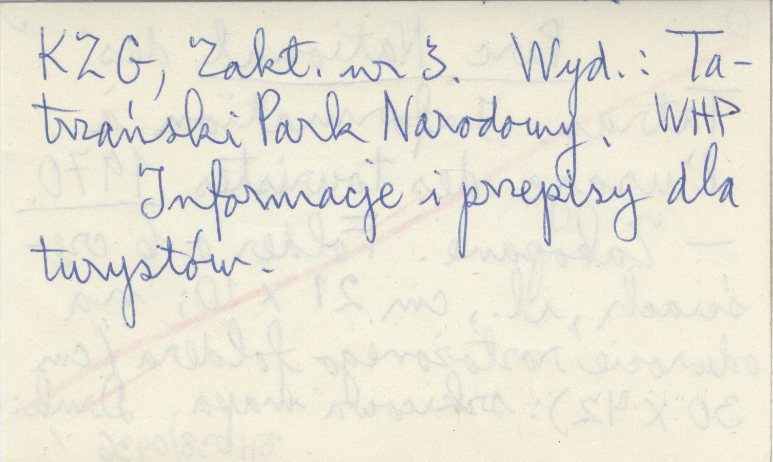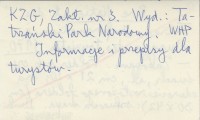 Tatrzański Park Narodowy, Zakopane , 6 cz., il., 1 m., 21x10 cm. Na odwrocie rozłożonego foldera (30x42 cm): szkicowa mapa. Druk: KZG, Zakł. nr 3. Informacje i przepisy dla turystów.