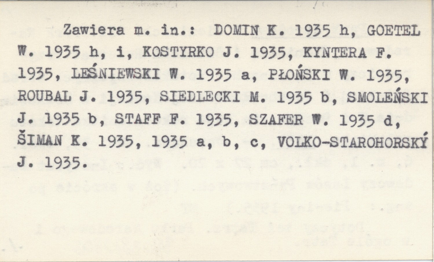 Instytut Badawczy Lasów Państwowych, Warszawa , 39 s., 6 k. tabl., 1 m., okł., 27x20 cm. (Toż w skrócie po ang.: Pieniny 1935). Dotyczy też Tatrz. Parku Narodowego i w ogóle Tatr. Zawiera m.in.: DOMIN K. 1935 h, GOETEL W. 1935 h, i, KOSTYRKO J. 1935, KYNTERA F. 1935, LEŚNIEWSKI W. 1935 a, PŁOŃSKI W. 1935, ROUBAL J. 1935, SIEDLECKI M. 1935 b, SMOLEŃSKI J. 1935 b, STAFF F. 1935, SZAFER W. 1935 d, ŠIMAN K. 1935, 1935 a, b, c, VOLKO-STAROHORSKÝ J. 1935.