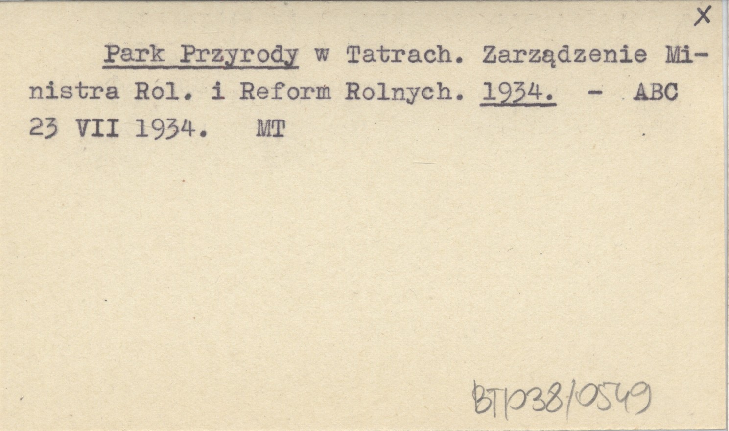 Park Przyrody w Tatrach. Zarządzenie Ministra Rol. i Reform Rolnych. 1934