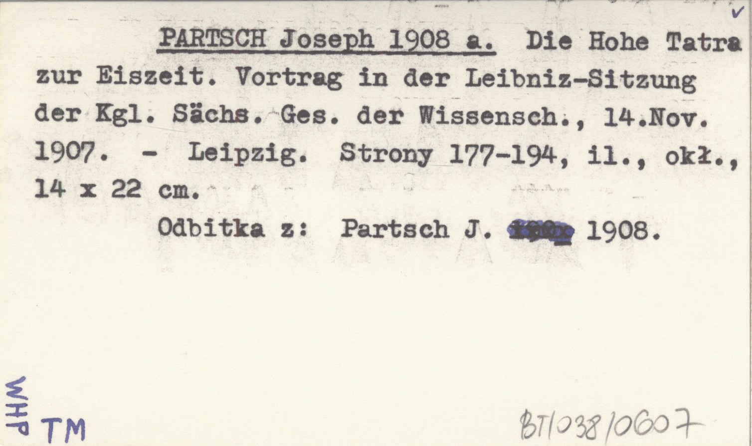 PARTSCH Joseph 1908 a Die Hohe Tatra zur Eiszeit. Vortrag in der Leibniz-Sitzung der Kgl. Sächs. Ges. der Wissensch., 14.Nov. 1907.