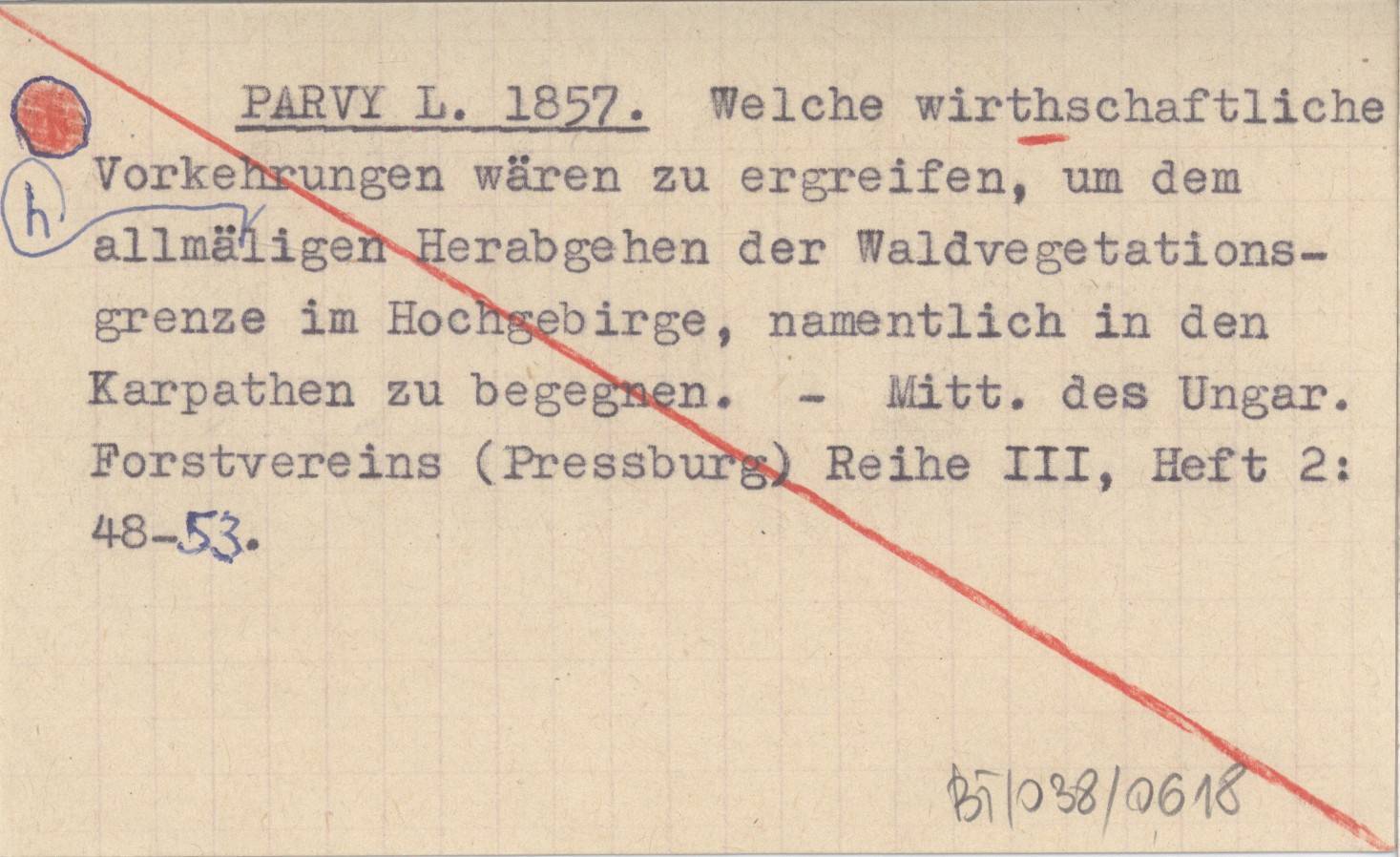 PARVY L. 1857 Welche wirthschaftliche Vorkehrungen wären zu ergreifen, um dem allmähligen Herabgehen der Waldvegetationsgrenze im Hochgebirge, namentlich in den Karpathen zu begegnen.