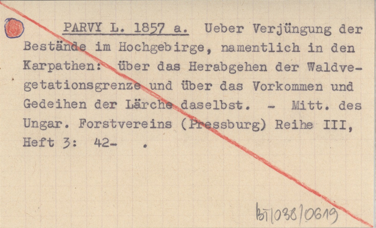 PARVY L. 1857 a Ueber Verjüngung der Bestände im Hochgebirge, namentlich in den Karpathen: über das Herabgehen der Waldvegetationsgrenze und über das Vorkommen und Gedeihen der Lärche daselbst.