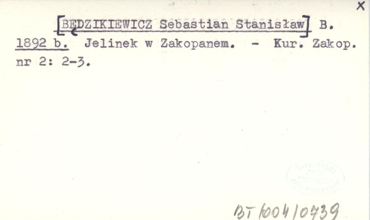 B. [BĘDZIKIEWICZ Sebastian Stanisław] 1892 b Jelinek w Zakopanem.
