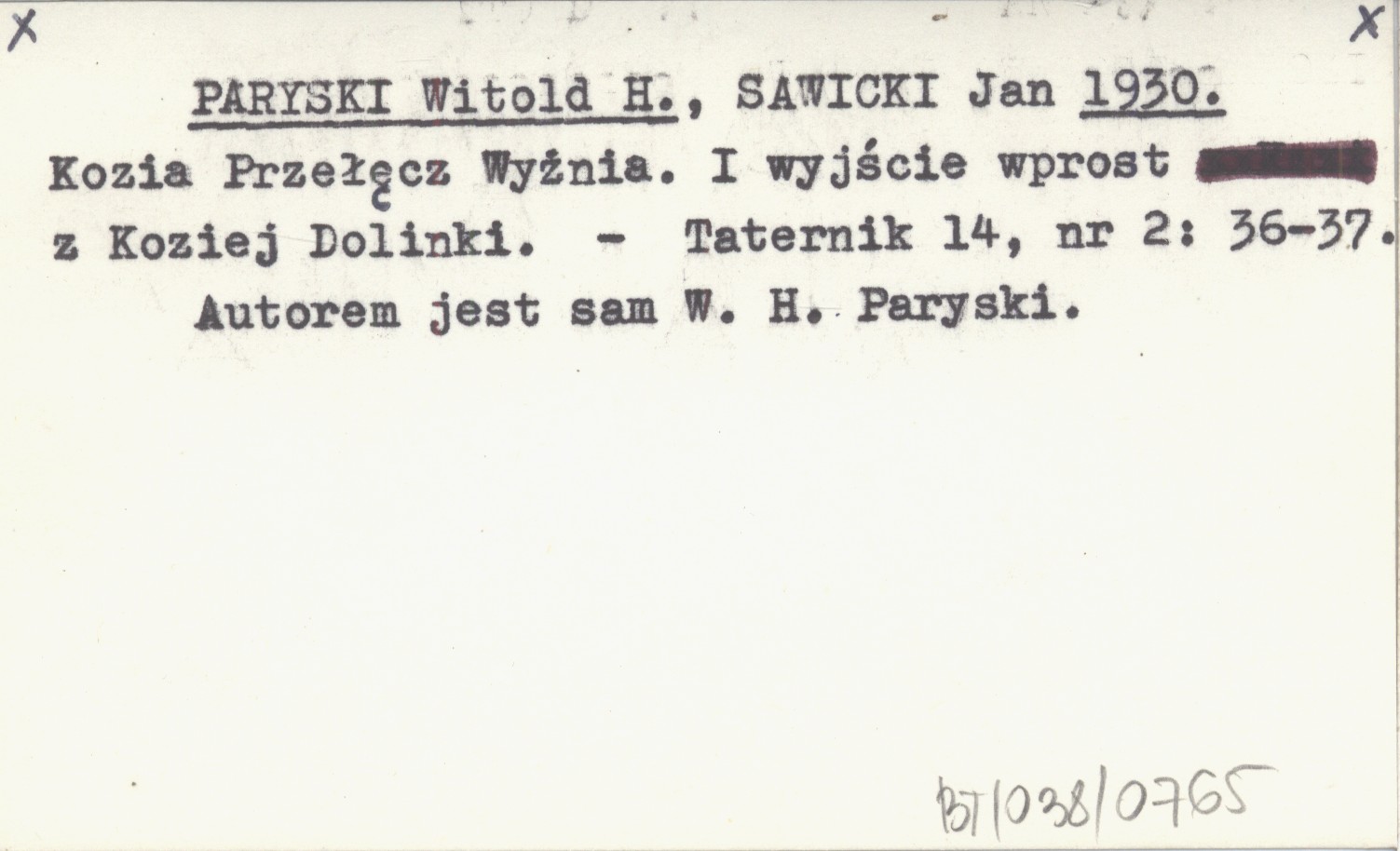 PARYSKI Witold H. SAWICKI, Jan. ; 1930 Kozia Przełęcz Wyżnia. I wyjście wprost z Koziej Dolinki.