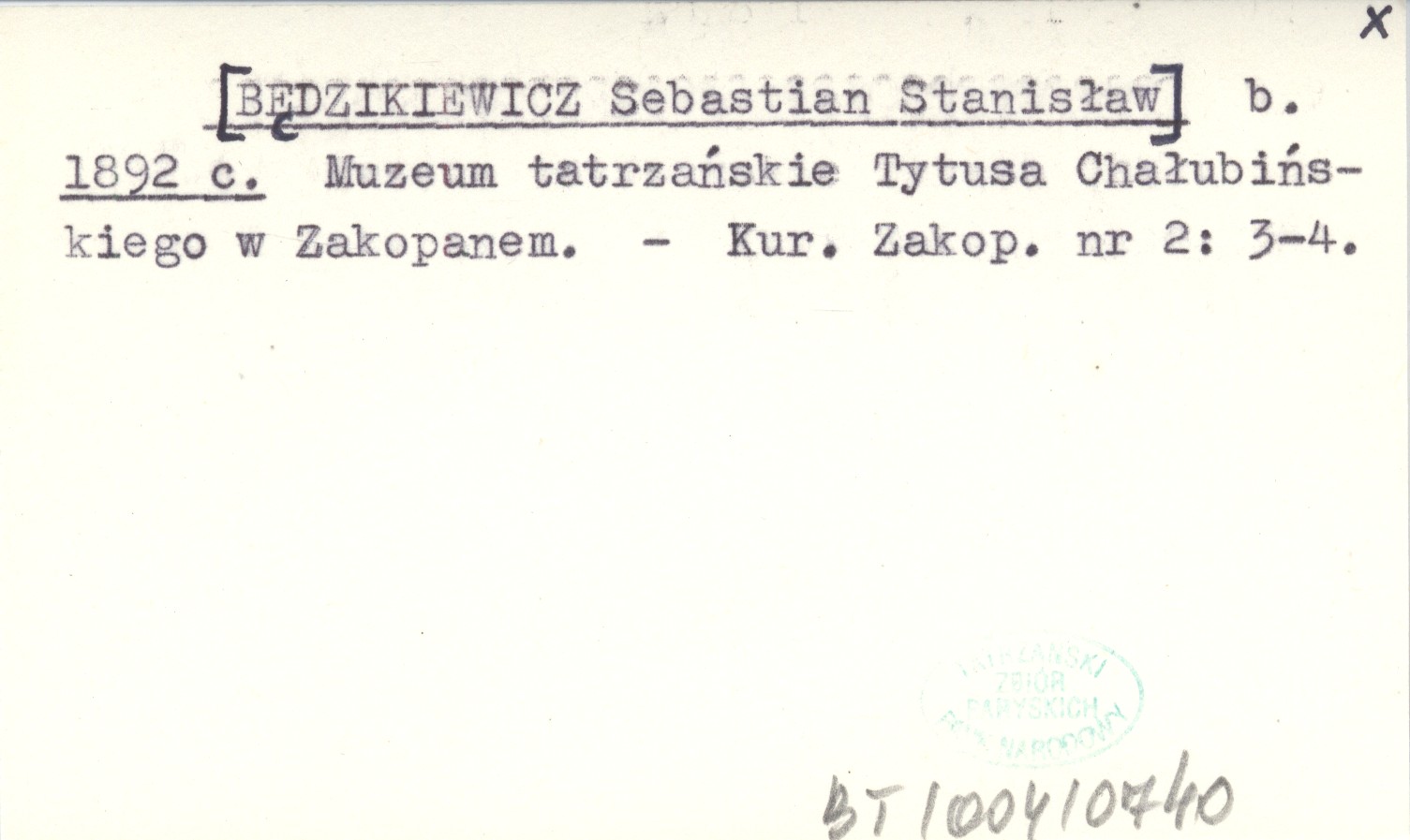 b. [BĘDZIKIEWICZ Sebastian Stanisław] 1892 c Muzeum tatrzańskie Tytusa Chałubińskiego w Zakopanem.