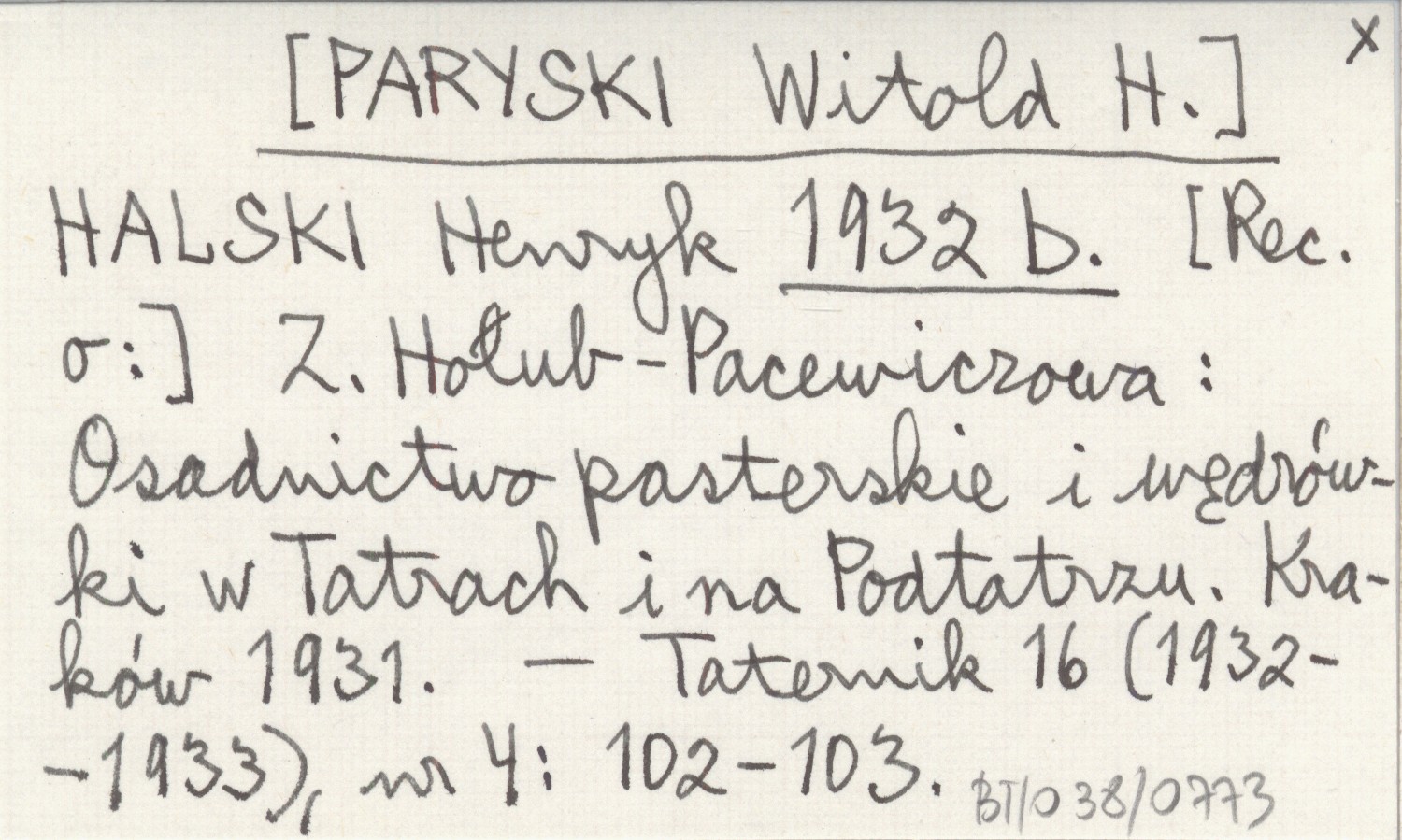 HALSKI Henryk [PARYSKI Witold H.] 1932 b Z. Hołub-Pacewiczowa: Osadnictwo pasterskie i wędrówki w Tatrach i na Podtatrzu. Kraków 1931.