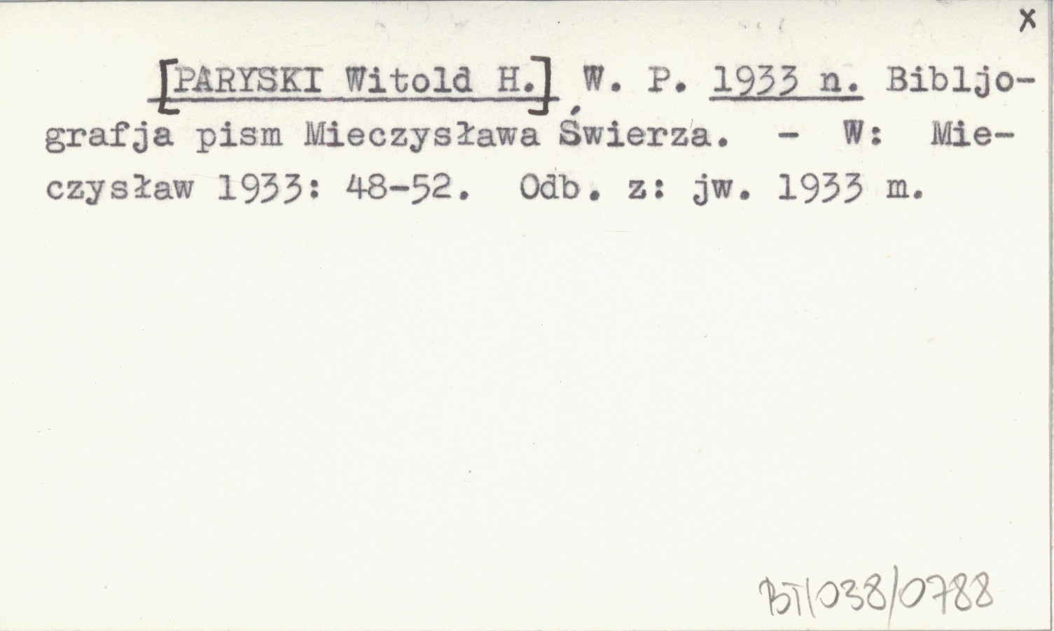 W. P. [PARYSKI Witold H.] 1933 n Bibljografja pism Mieczysława Świerza.