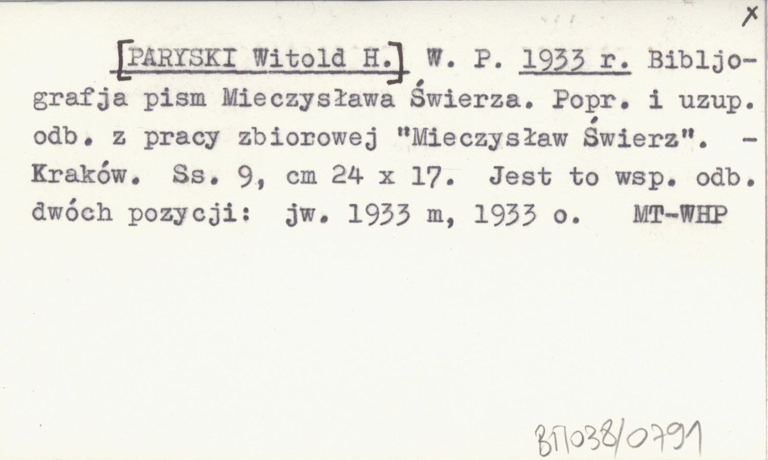 W. P. [PARYSKI Witold H.] 1933 r Bibljografja pism Mieczysława Świerza. Popr. i uzup. odb. z pracy zbiorowej "Mieczysław Śwerz".