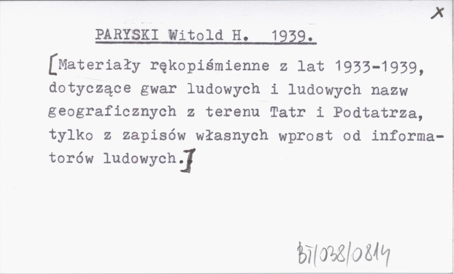 PARYSKI Witold H. 1939 [Materiały rękopiśmienne z lat 1933-1939, dotyczące gwar ludowych i ludowych nazw geograficznych z terenu Tatr i Podtatrza, tylko z zapisów własnych wprost od informatorów ludowych].