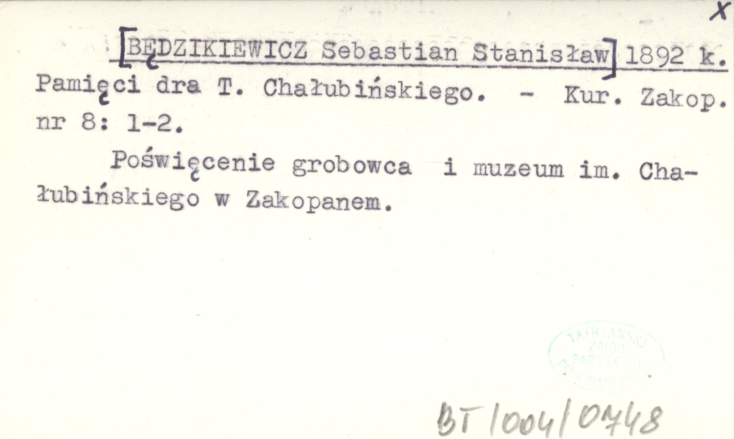 [BĘDZIKIEWICZ Sebastian Stanisław] 1892 k Pamięci dra T. Chałubińskiego.