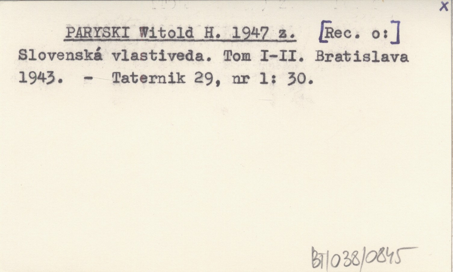 PARYSKI Witold H. 1947 z Slovenská vlastiveda. Tom I-II. Bratislava 1943.