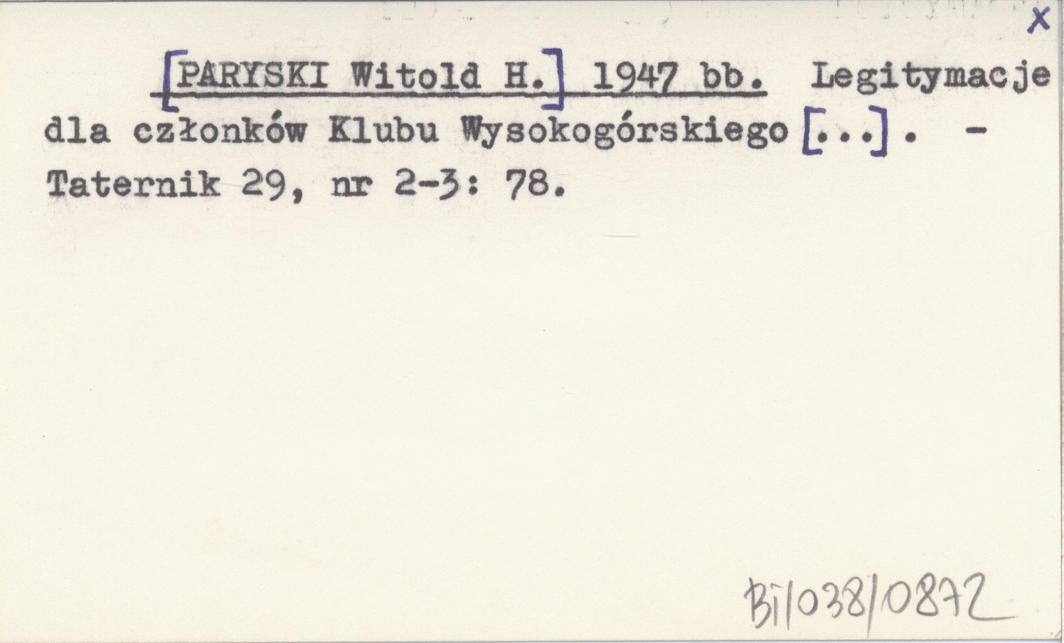 [PARYSKI Witold H.] 1947 bb Legitymacje dla członków Klubu Wysokogórskiego [...].