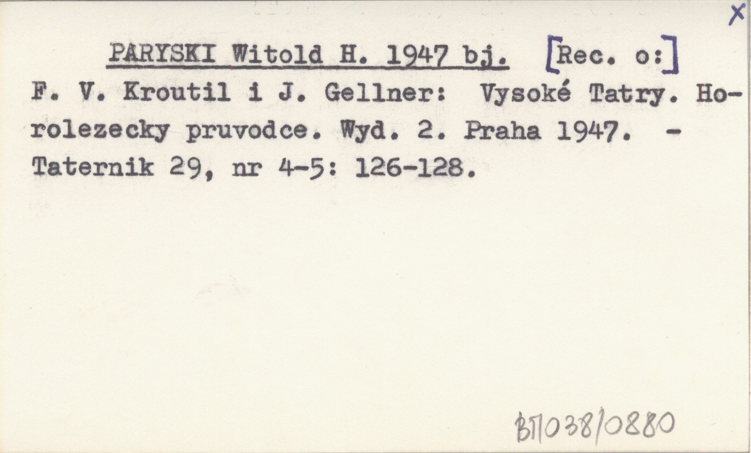 PARYSKI Witold H. 1947 bj F. V. Kroutil i J. Gellner: Vysoké Tatry. Horolezecky pruvodce. Wyd. 2. Praha 1947.