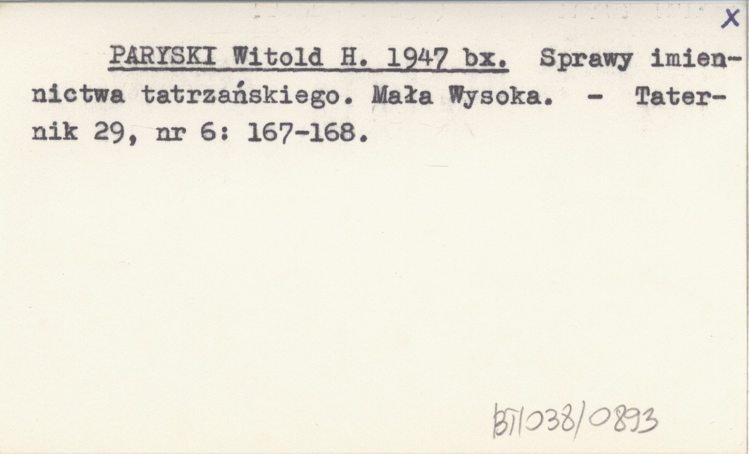 PARYSKI Witold H. 1947 bx Sprawy imiennictwa tatrzańskiego. Mała Wysoka.