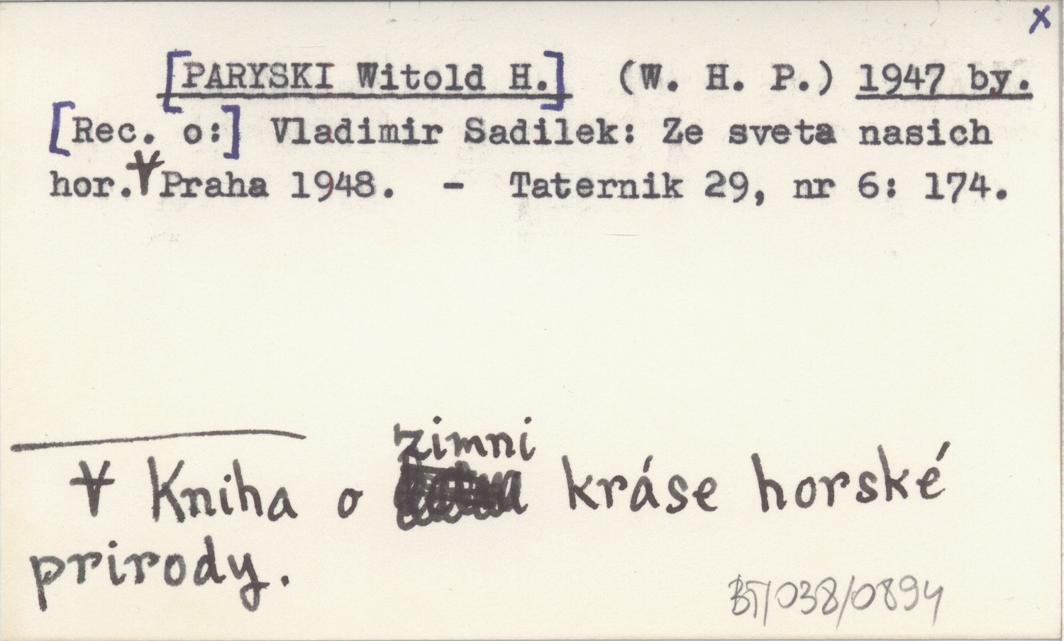 (W. H. P.) [PARYSKI Witold H.] 1947 by Vladimir Sadilek: Ze sveta nasich hor. Kniha o zimni kráse horské prirody. Praha 1948.