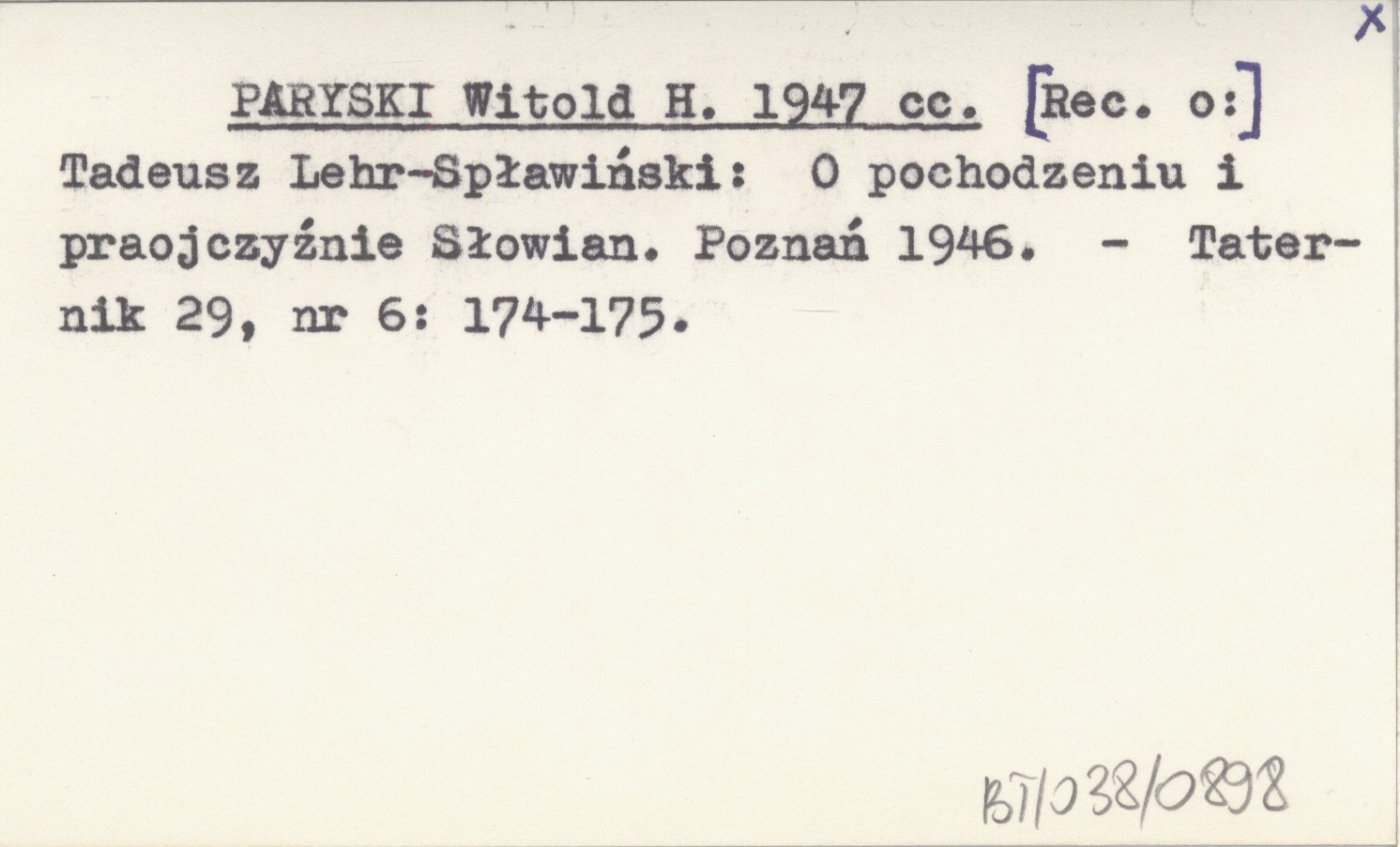 PARYSKI Witold H. 1947 cc Tadeusz Lehr-Spławiński: O pochodzeniu i praojczyźnie Słowian. Poznań 1946.