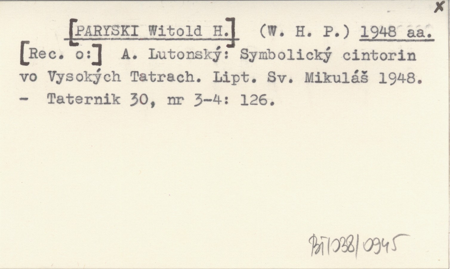 (W. H. P.) [PARYSKI Witold H.] 1948 aa A. Lutonskę: Symbolickę cintorin vo Vysokęch Tatrach. Lipt. Sv. Mikuláč 1948.