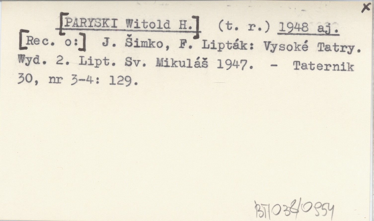 (t. r.) [PARYSKI Witold H.] 1948 aj J. Šimko, F. Lipták: Vysoké Tatry. Wyd. 2. Lipt. Sv. Mikuláš 1947.
