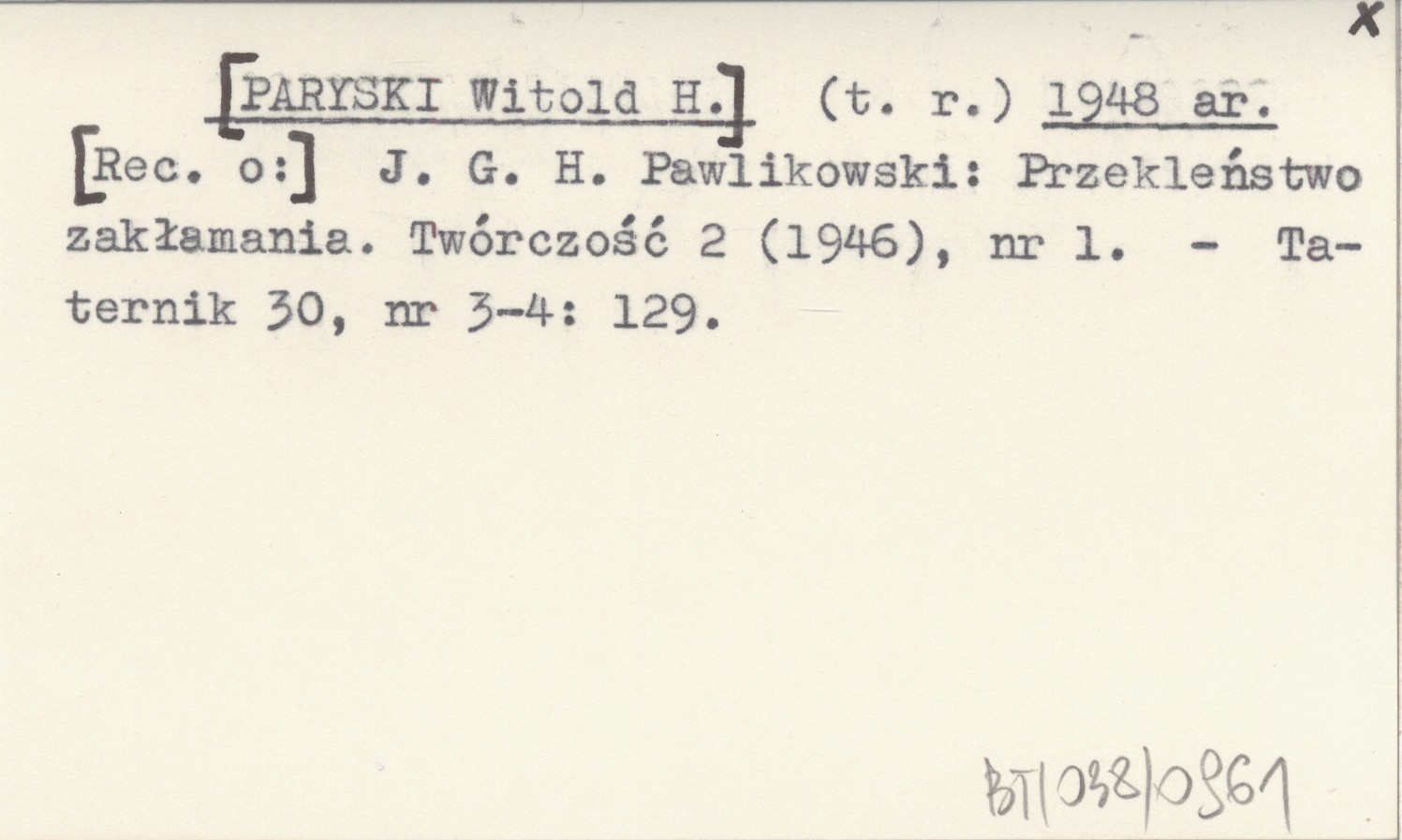 (t. r.) [PARYSKI Witold H.] 1948 ar J. G. H. Pawlikowski: Przekleństwo zakłamania. Twórczość 2 (1946), nr 1.