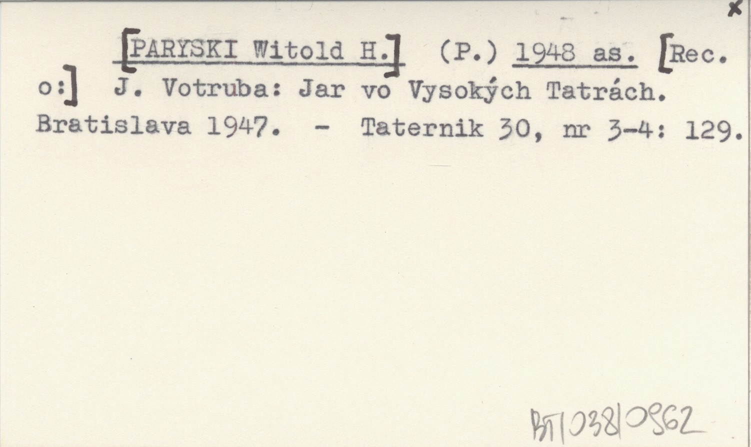 (P.) [PARYSKI Witold H.] 1948 as J. Votruba: Jar vo Vysokých Tatrách. Bratislava 1947.