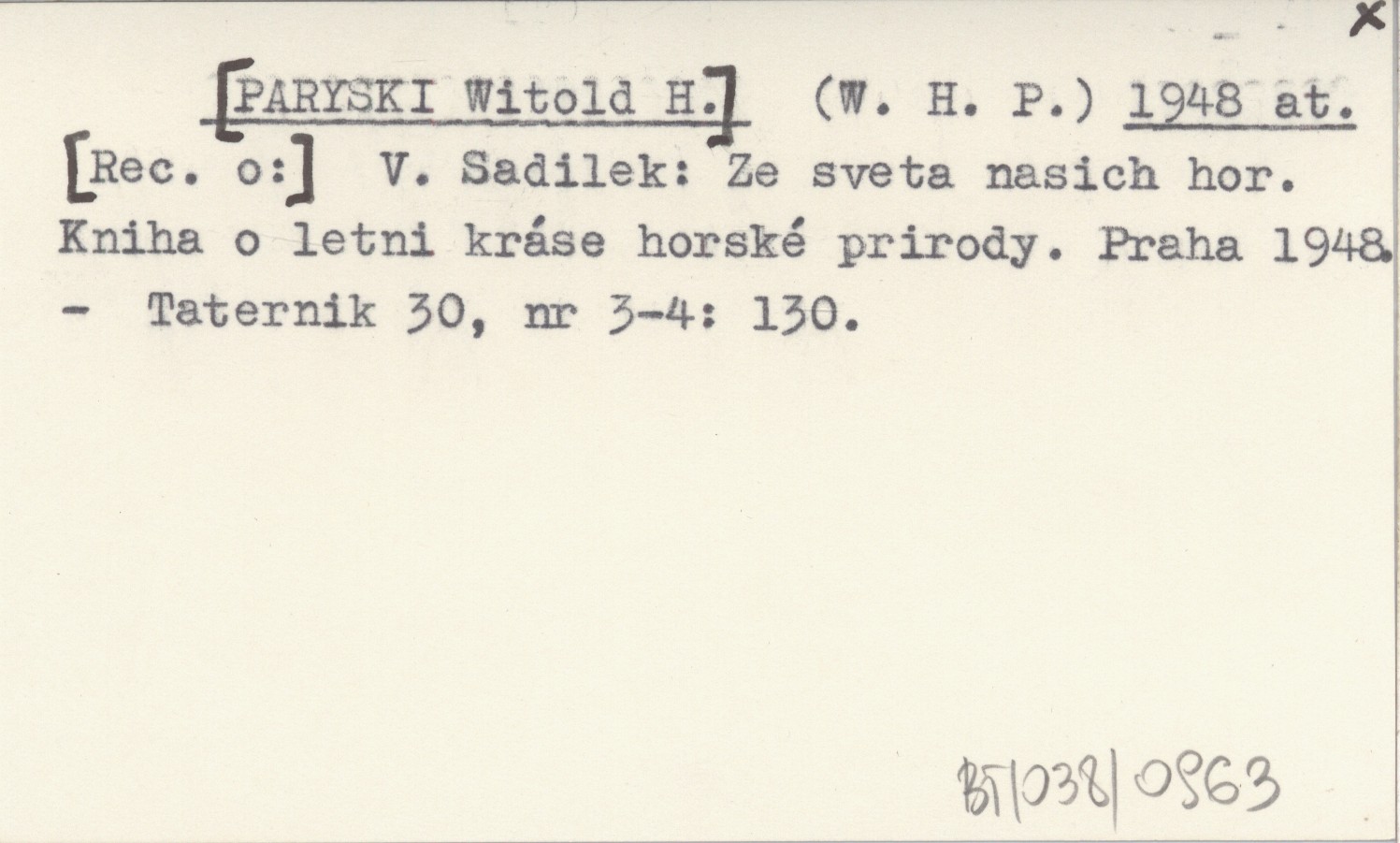(W. H. P.) [PARYSKI Witold H.] 1948 at V. Sadilek: Ze sveta nasich hor. Kniha o letni kráse horské prirody. Praha 1948.