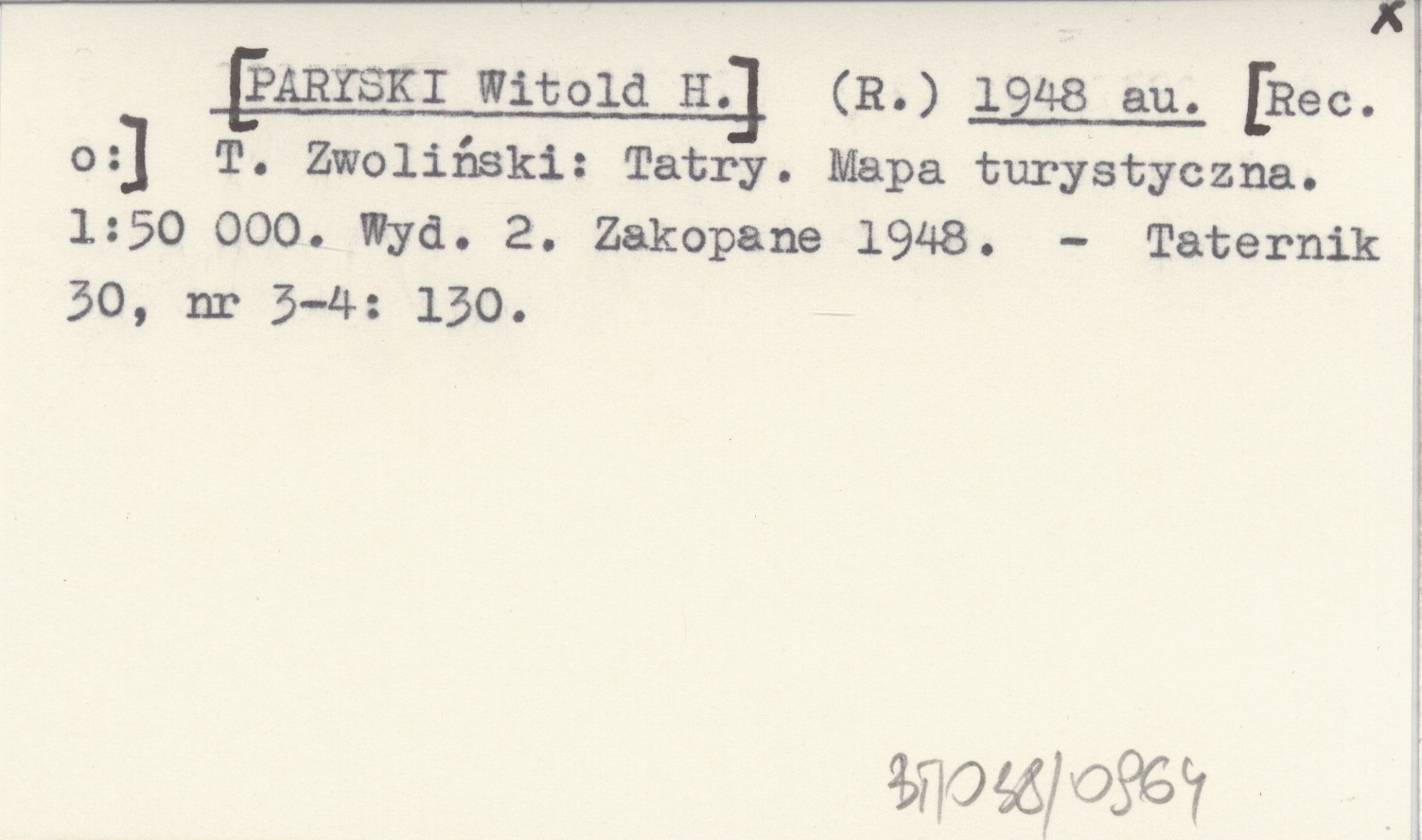 (R.) [PARYSKI Witold H.] 1948 au T. Zwoliński: Tatry. Mapa turystyczna. 1:50 000. Wyd. 2. Zakopane 1948.