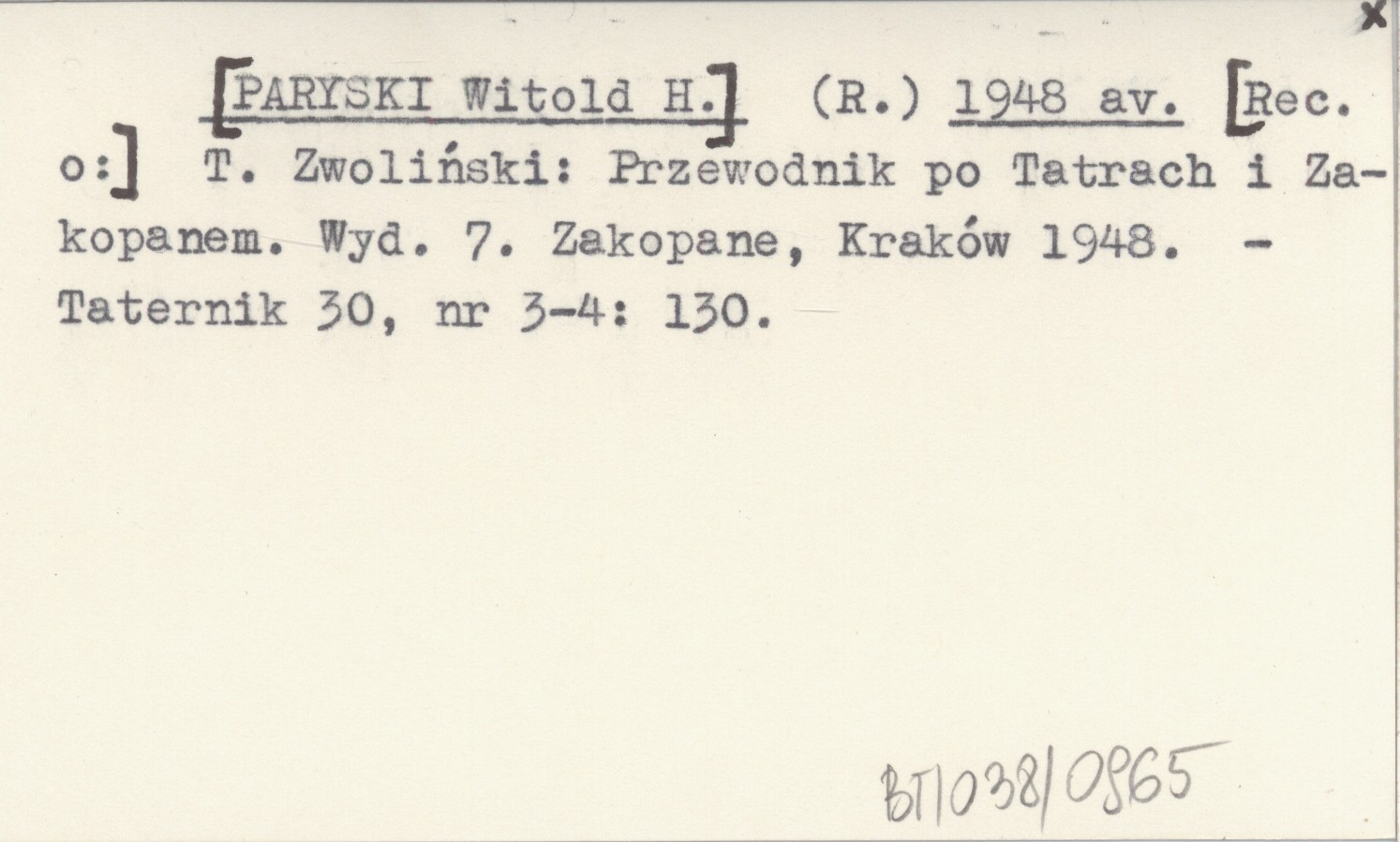 (R.) [PARYSKI Witold H.] 1948 av T. Zwoliński: Przewodnik po Tatrach i Zakopanem. Wyd. 7. Zakopane, Kraków 1948.